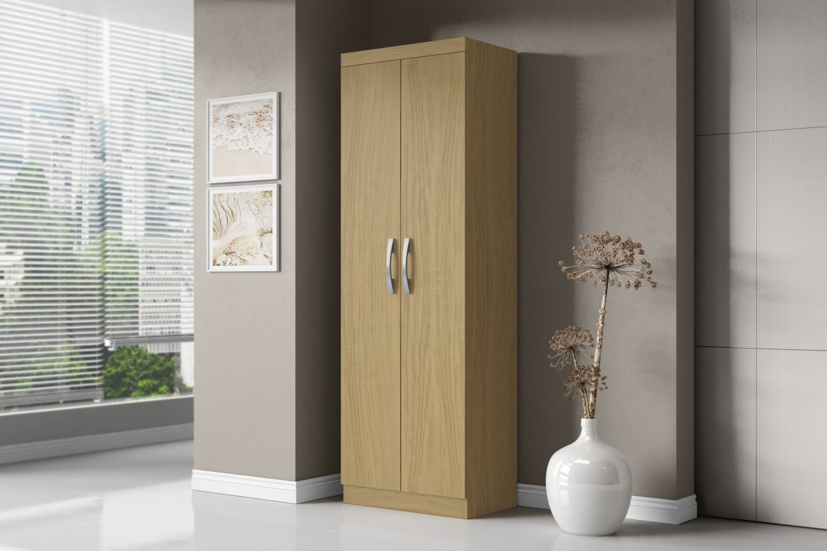 Armário Multiuso 02 portas. Produzido em aglomerado 12mm de espessura, proporcionando resistência e durabilidade. Amplo espaço interno, garantindo maior firmeza ao móvel. Puxadores de Plástico dando maior resistência. 03 Prateleiras amplas, proporcionando maior conforto e comodidade em guardar seu sapatos sem amassar. Dobradiças metálicas dando maior durabilidade e resistência ao abrir e fechar as portas. Acabamento em verniz texturizado fosco e verniz brilho nas portas, garantindo a conservação do móvel, além de manter a beleza constante oferece ao móvel, resistência e durabilidade prolongando a vida útil do produto.