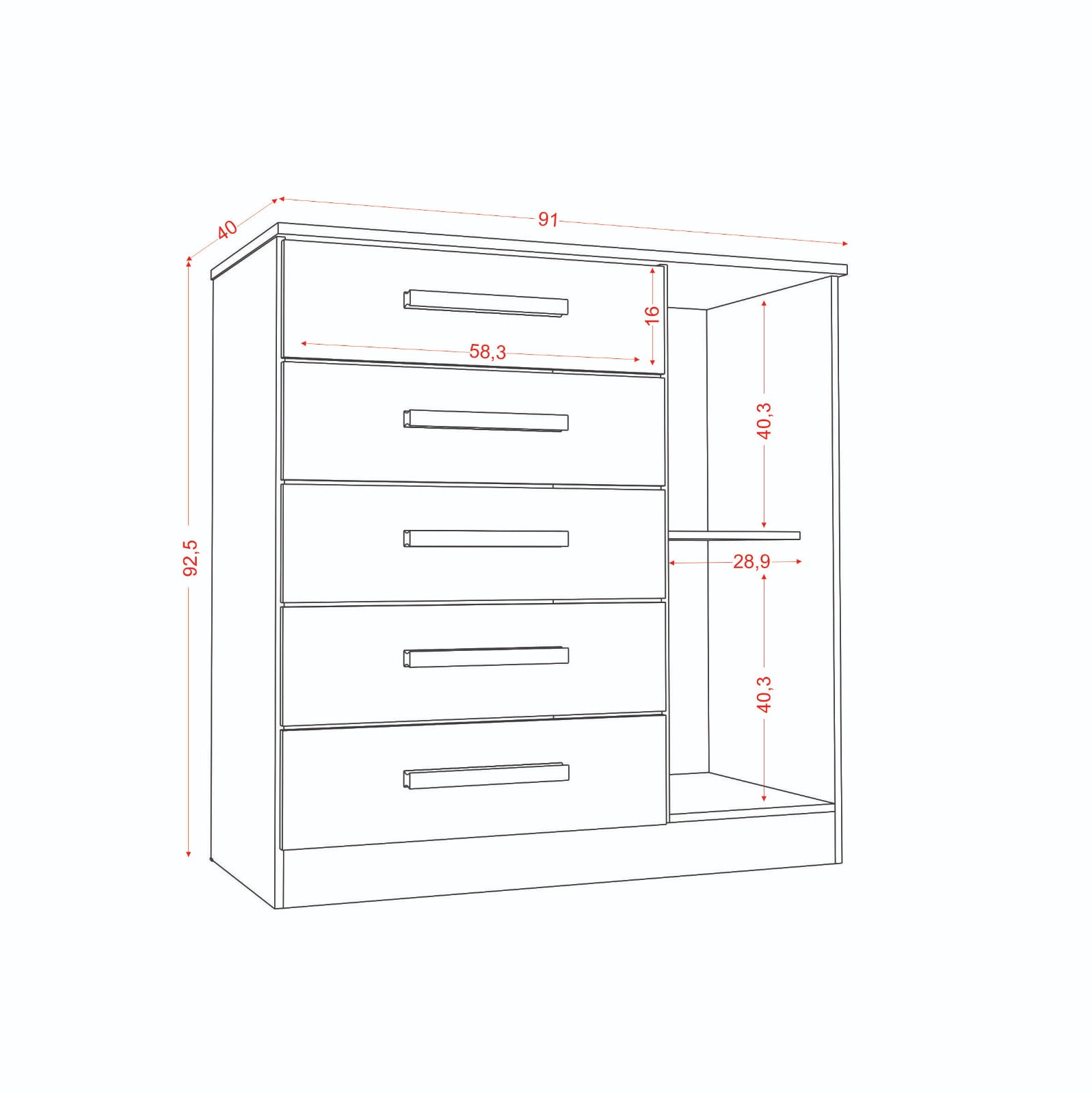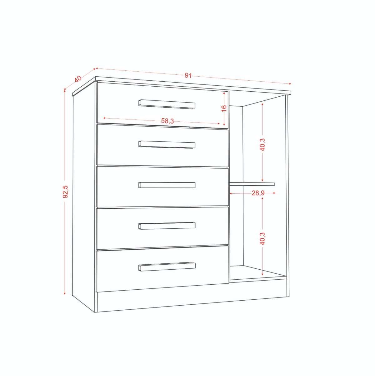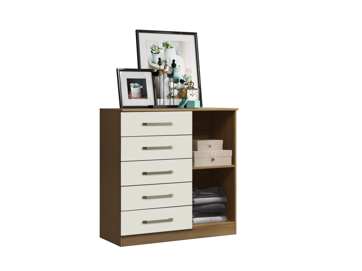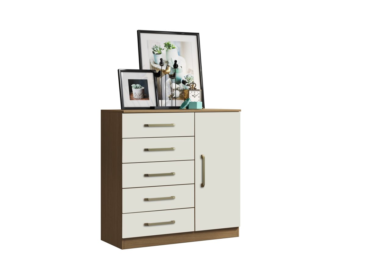 Cômoda 01 porta 05 gavs. Produzido em MDP 12mm e 15mm de espessura, proporcionando resistência e durabilidade. Amplo espaço interno, garantindo maior firmeza ao móvel. Puxadores de Plástico dando maior resistência. Dobradiças metálicas dando maior durabilidade e resistência ao abrir e fechar as portas. Acabamento em verniz alto brilho, garantindo a conservação do móvel, além de manter o brilho constante oferece ao móvel beleza, resistência e durabilidade prolongando a vida útil do produto.