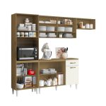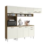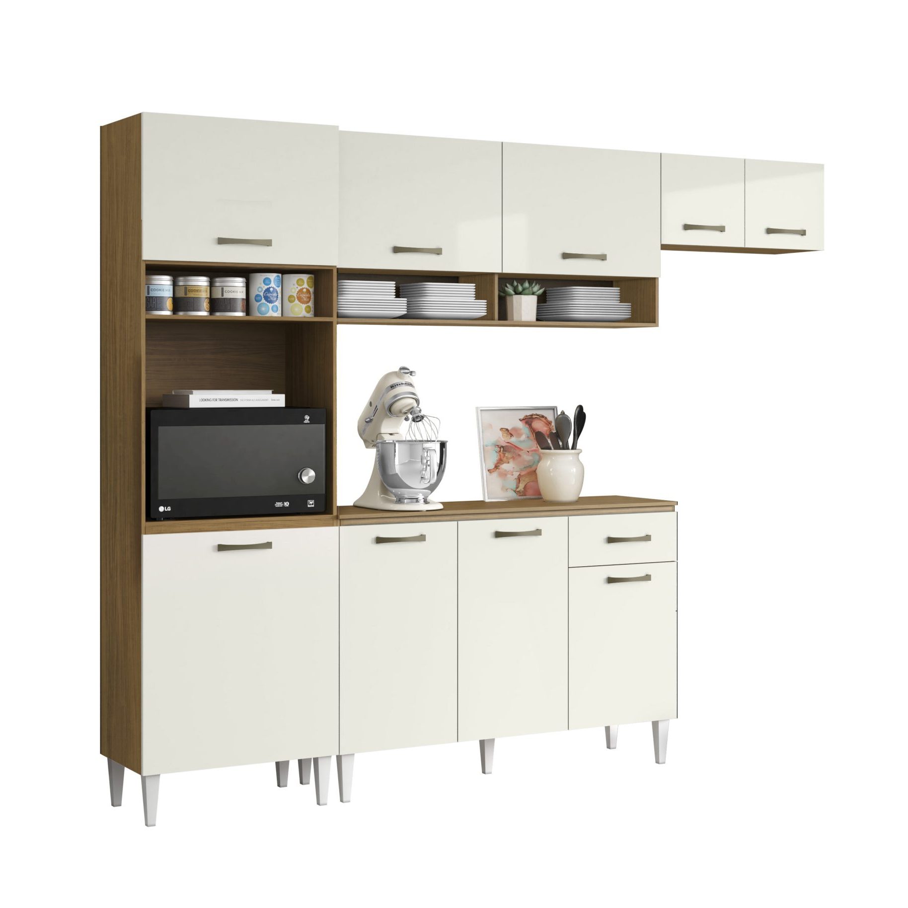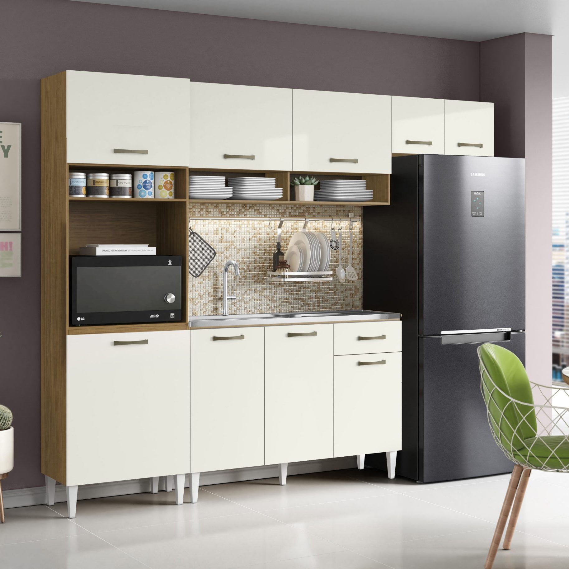 Cozinha Compacta Aurora. Produzido em MDP de 15mm e 12mm de espessura, proporcionando resistência e durabilidade. Sistema de sustentação com pés proporcionando maior firmeza ao produto. Puxadores de Plástico dando maior resistência. Dobradiças das portas metálicas dando maior durabilidade e resistência ao abrir e fechar as portas. Acabamento em verniz texturizado fosco e verniz brilho nas portas, garantindo a conservação do móvel, além de manter a beleza constante oferece ao móvel, resistência e durabilidade prolongando a vida útil do produto.